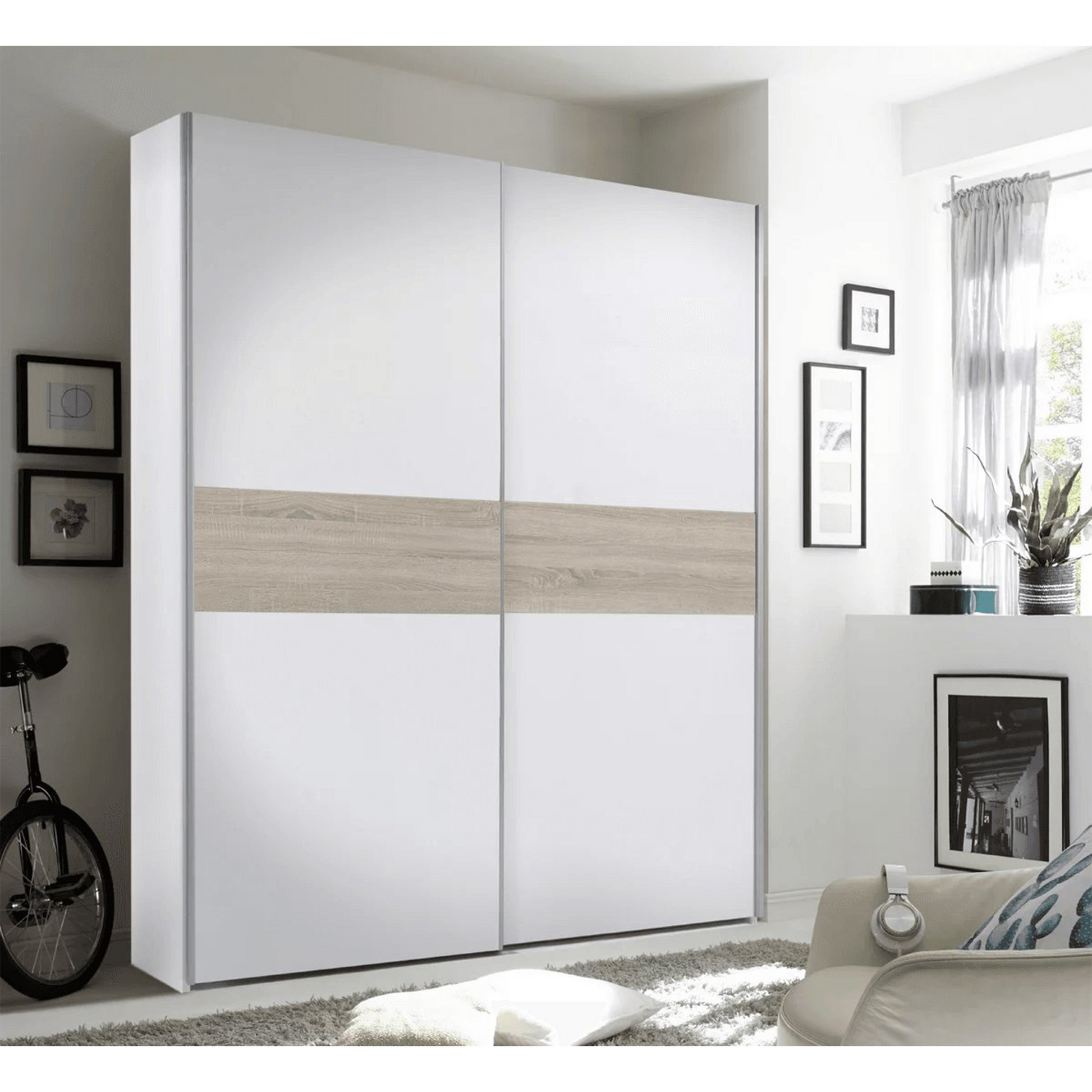 • Design Versatil și Eleganță Modernă: Cu o combinație de finisaje Alb și Sonoma Eiche, șifonierul emană un aspect contemporan și versatil. Se integrează perfect în orice decor de dormitor, adăugând un strop de eleganță.